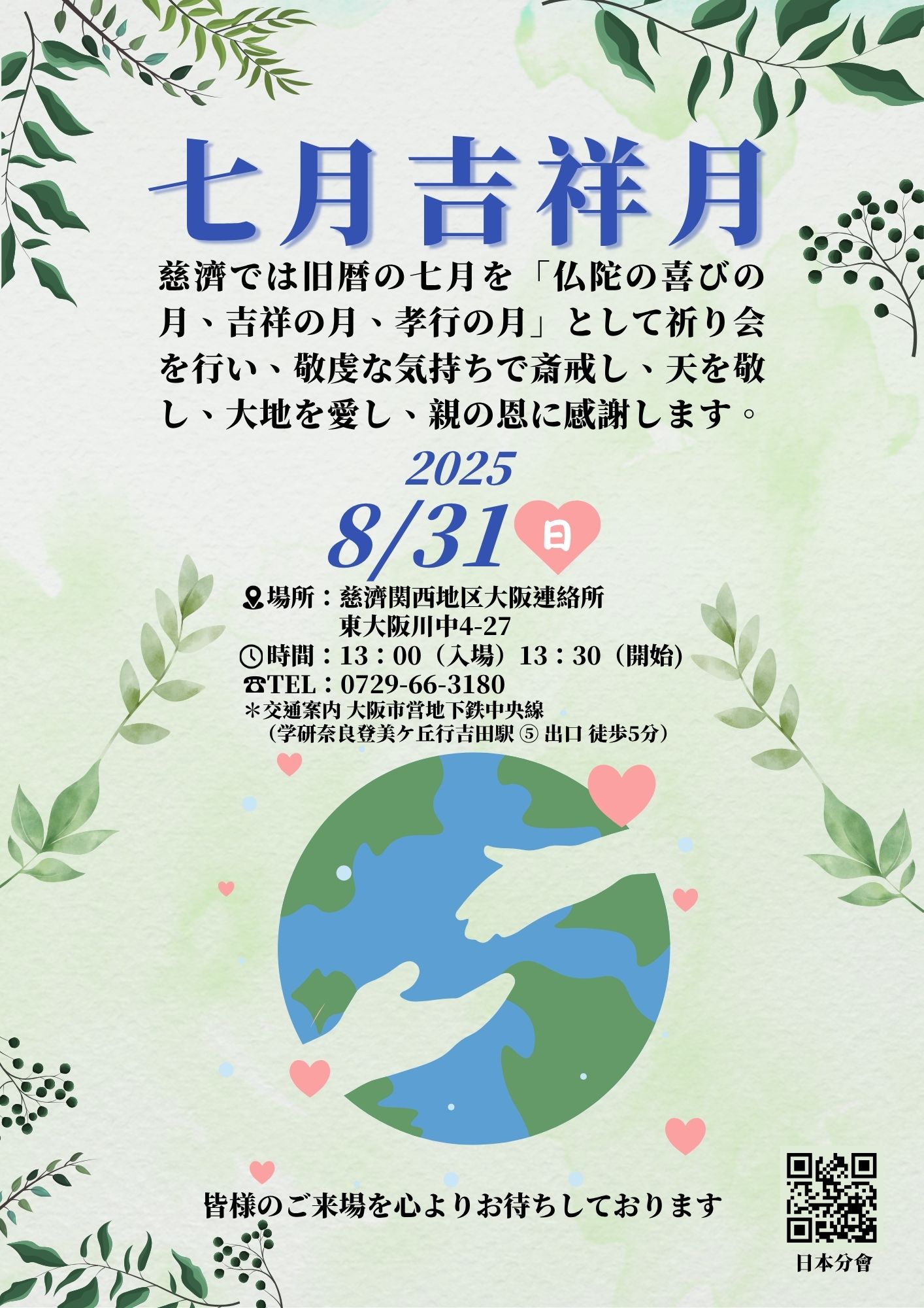 慈濟では旧暦の七月を「仏陀の喜びの月、吉祥の月、孝行の月」として祈り会を行い、敬虔な気持ちで斎戒し、天を敬し、大地を愛し、親の恩に感謝します。皆様のご来場を心よりお待ちしております。