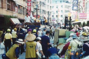 ハブ台風(台風9号)は台湾の過去30年で最大級の洪水災害を引き起こした。慈濟ボランティアは「最初に駆けつけて手を差し伸べ、最後まで尽くす」という理念で、災害後の半月間に数万人を動員して救援活動にあたった。證嚴上人は「近所を支え合い、助け合う」ことを掲げ、慈濟ボランティアを居住地域別に再編成し、「地域ボランティア」という概念を広めた。